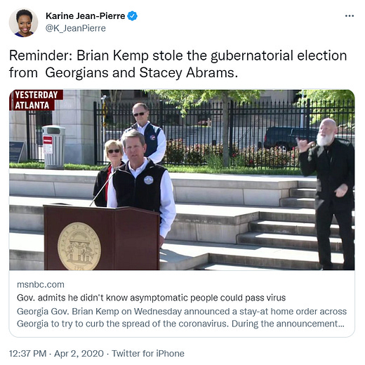 Remember when Georgia Gov. Brian Kemp signed an election law last year to improve voting security and the media spent more or less the entire month in a state of schizo apoplexy and Biden went as far as to declare the arrival of Jim Crow in the 21st century? MSNBC host Joy Reid, whom I despise and have no qualms about admitting so, tweeted that "Jim Crow is alive and well in Georgia. Somebody call Jim Eagle.” It's incredible she still has a show. I would seriously rather take a swift kick to the groin from Lionel Messi wearing a steel-toed boot than watch an entire episode of her pontificating.