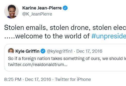 Secondly, and this is something I'm talking about in my next post as well: This incident is another that should be added to the Left’s running tally of authoritarian schemes they've used to subvert democracy in the name of saving it. If that sounds ass backwards that's because it is. Ever since the 2016 defeat of the rightful heir to the White House throne, Hillary Clinton, the Left has adopted a ideological framework that basically absolves them of their descent into tyrannical authoritarianism.1
